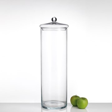 Γυάλινο βάζο κύλινδρος με καπάκι από φυσητό γυαλί. Αποτελεί ιδανική επιλογή για event καθώς αναδεικνύει τα τρόφιμα και συγχρόνως διακοσμεί τον χώρο δεξίωσης ή μαζικής εστίασης. Μπορεί, επίσης, να χρησιμοποιηθεί για τους ίδιους λόγους και στον προσωπικό σας χώρο.