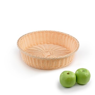 Καλάθι από polyrattan με κλίση, μεταλλικό σκελετό σε καφέ χρώμα. Μπορεί να χρησιμοποιηθεί για την αποθήκευση και παρουσίαση τροφίμων.